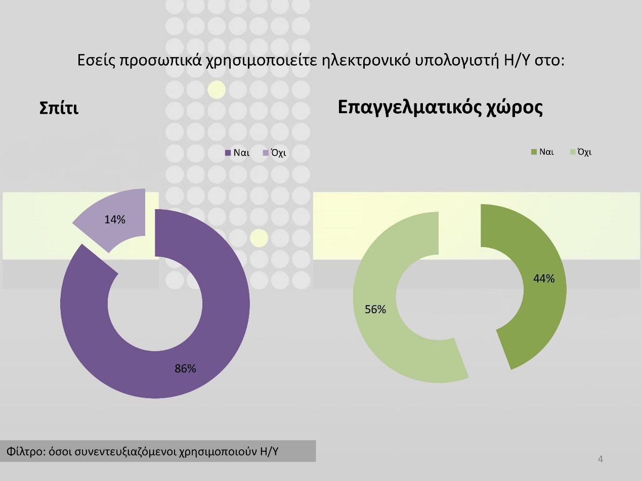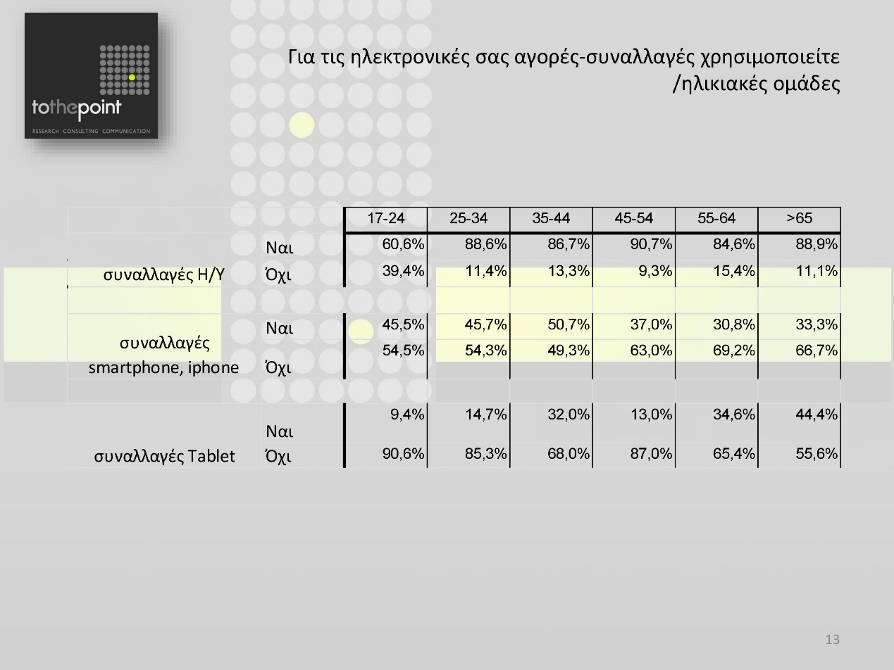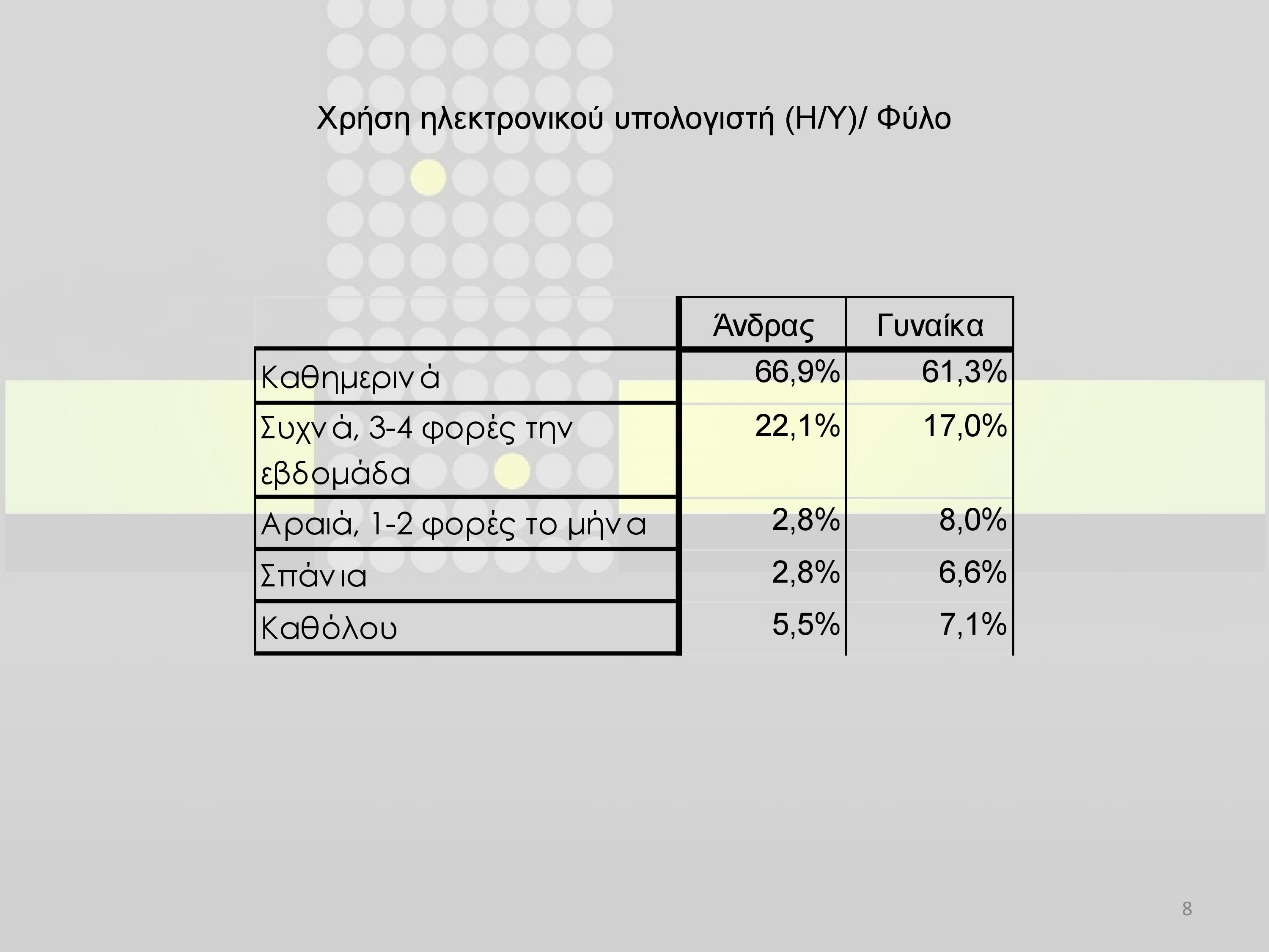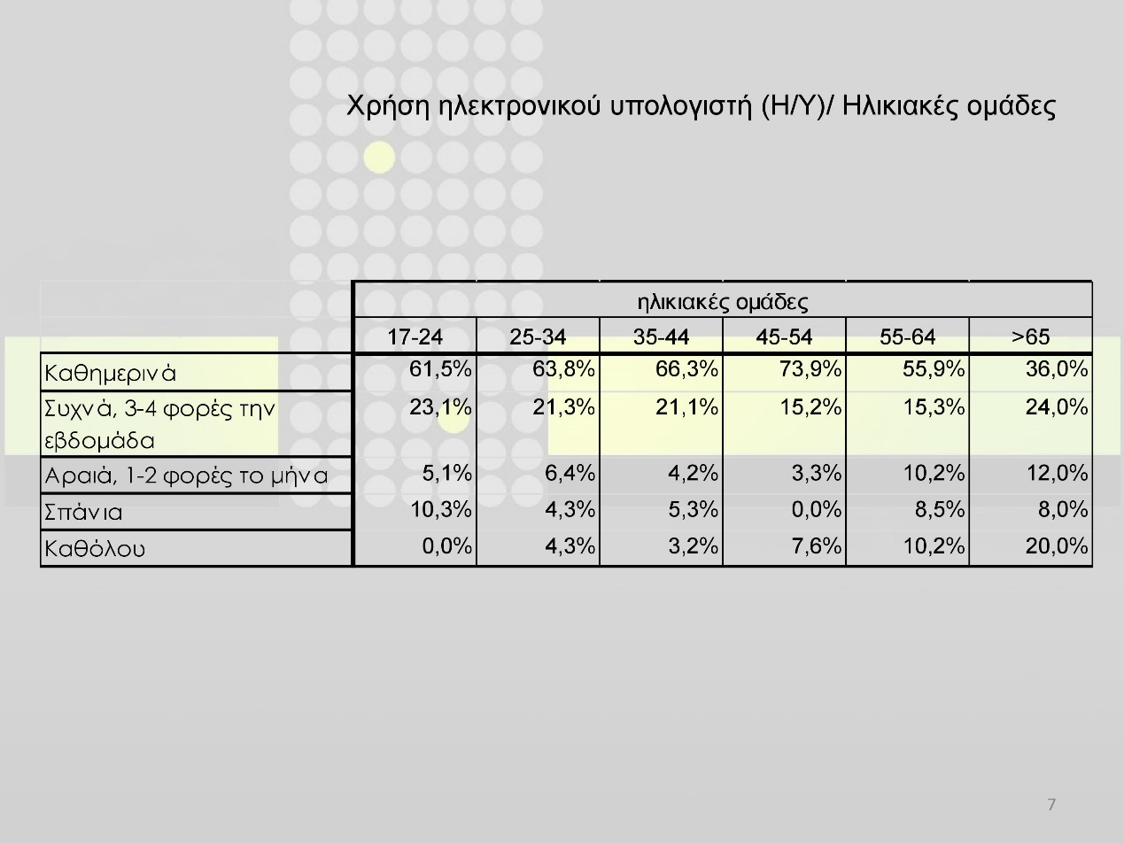Ένα ακόμη εύρημα που πιθανόν να μη συνάδει με αυτά που ισχύουν σε ευρωπαϊκό επίπεδο είναι η κάθετη πτώση της χρήσης Η/Υ και των υπολοίπων συσκευών που προαναφέρθηκαν από την ηλικία των 60 ετών και άνω (20% καθόλου χρήση Η/Υ σε ανθρώπους πάνω από 65 ετών και μηδενικό, φυσικά, ποσοστό στην ηλικιακή κατηγορία των native users από 17-24 ετών).