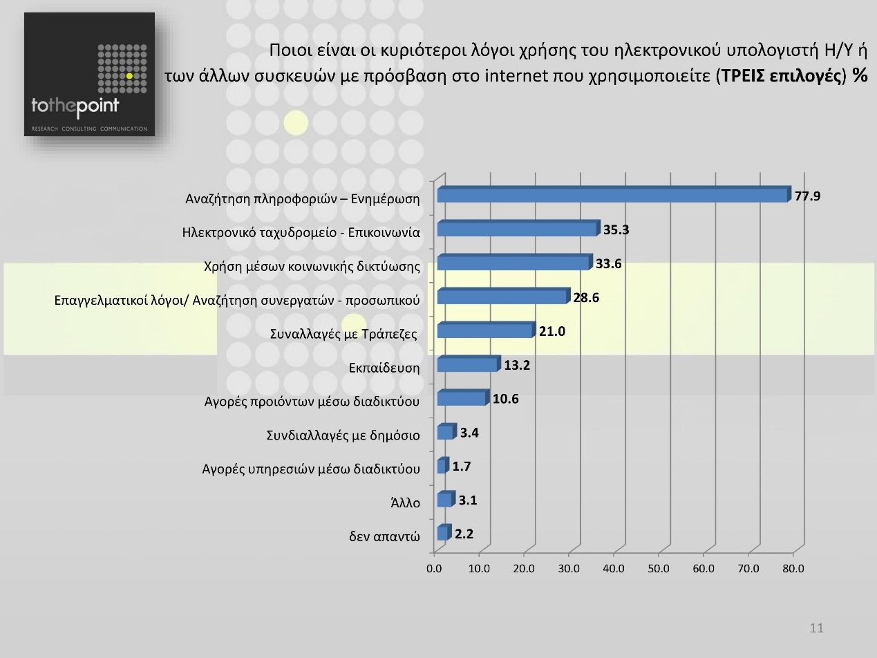 Η ενημέρωση, τα emails και τα social media είναι είναι οι κυριότεροι λόγοι για τους οποίους οι Θεσσαλονικείς μπαίνουν online, είτε μέσω Ηλεκτρονικού Υπολογιστή, είτε χρησιμοποιώντας άλλες συσκευές. Όπως ήταν ίσως αναμενόμενο, οι νεότερες ηλικίες (κάτω των 40 ετών) είναι πολύ πιο εξοικειωμένες με τη χρήση συσκευών, πέραν των Η/Υ και με την πρακτική των ηλεκτρονικών συναλλαγών.
