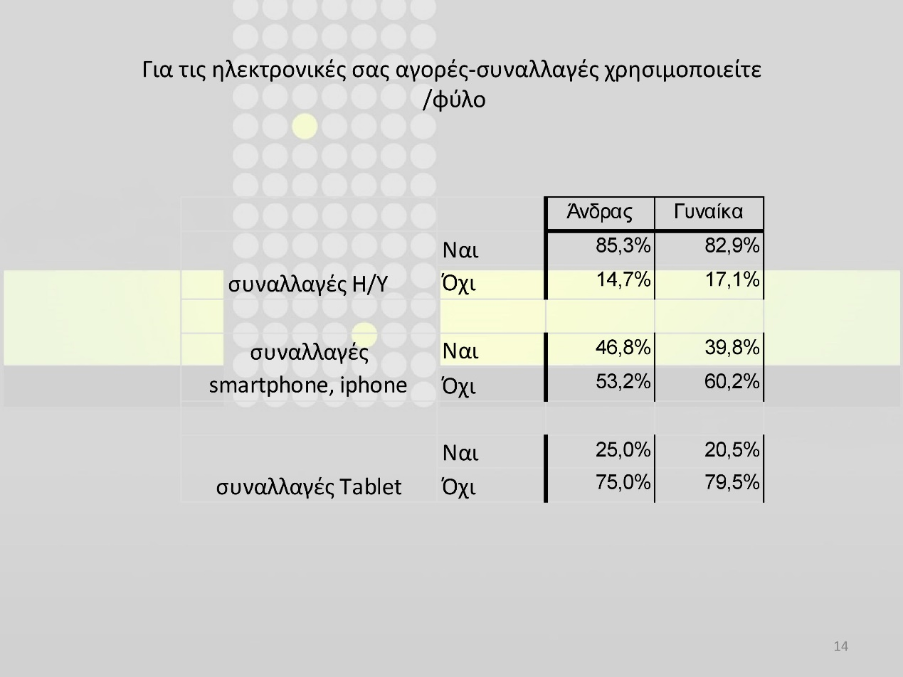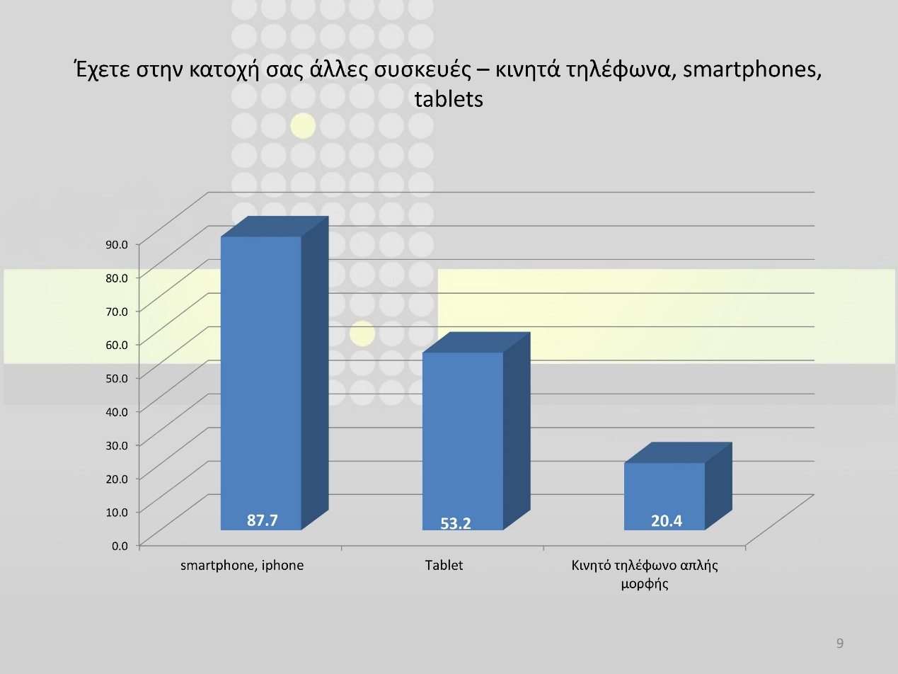 Η χρήση των ηλεκτρονικών συναλλαγών έχει ενισχυθεί και από τη μεγάλη αύξηση στην κατοχή συσκευών, πέραν των Η/Υ, που μπορούν να συνδεθούν στο Internet, όπως τα smartphones (περίπου 77% των ερωτηθέντων δηλώνει πως κατέχει smartphone ενώ το 45% περίπου των ερωτηθέντων κατέχει tablet).