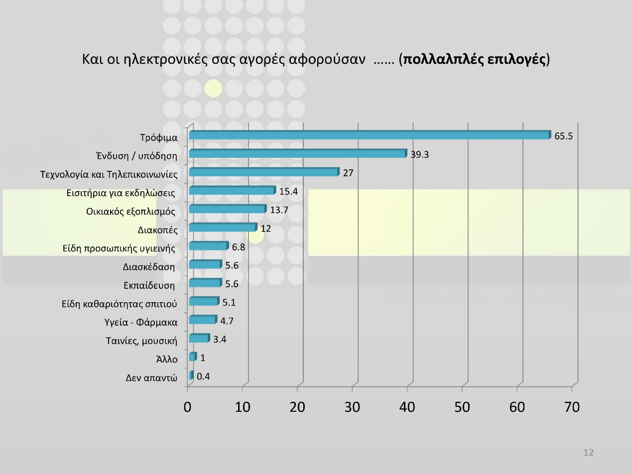 Πάντως , ειδικά στο θέμα της αγοράς αγαθών ή υπηρεσιών μέσω του διαδικτύου τα ποσοστά είναι ακόμη χαμηλά σε σχέση με αυτά της Ε.Ε. -10,6% για προϊόντα και λιγότερο από 2% για τις υπηρεσίες-, γεγονός που υποδεικνύει ότι ο τομέας αυτός μπορεί να αναπτυχθεί στο μέλλον ιδιαιτέρως δυναμικά. Ας σημειωθεί πως οι πρώτες τρεις επιλογές αγαθών όσον αφορά τις ηλεκτρονικές συναλλαγές είναι τα τρόφιμα, η ένδυση/υπόδηση και οι τηλεπικοινωνίες.