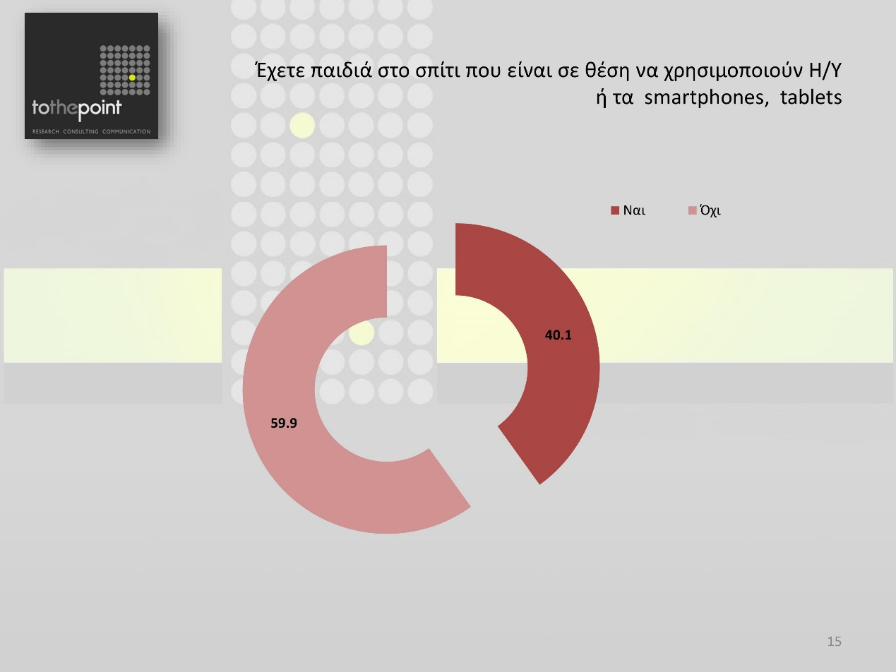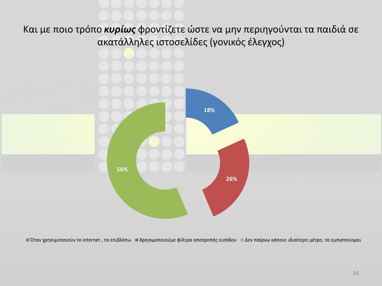 Ένα εύρημα στο οποίο θα ήθελα να σταθώ ιδιαίτερα είναι ότι ενώ το 60% των ερωτηθέντων έχουν στο σπίτι τους παιδιά́ που είναι σε θέση να χρησιμοποιούν Η/Υ ή smartphones και tablets - ανάμεσα τους και εγώ - το 56% δεν ασκούν κανενός είδους γονικό έλεγχο στα παιδιά της οικογένειας κατά την περιήγηση τους στο Διαδίκτυο, είτε επιβλέποντας τα, είτε κάνοντας χρήση ειδικών φίλτρων.