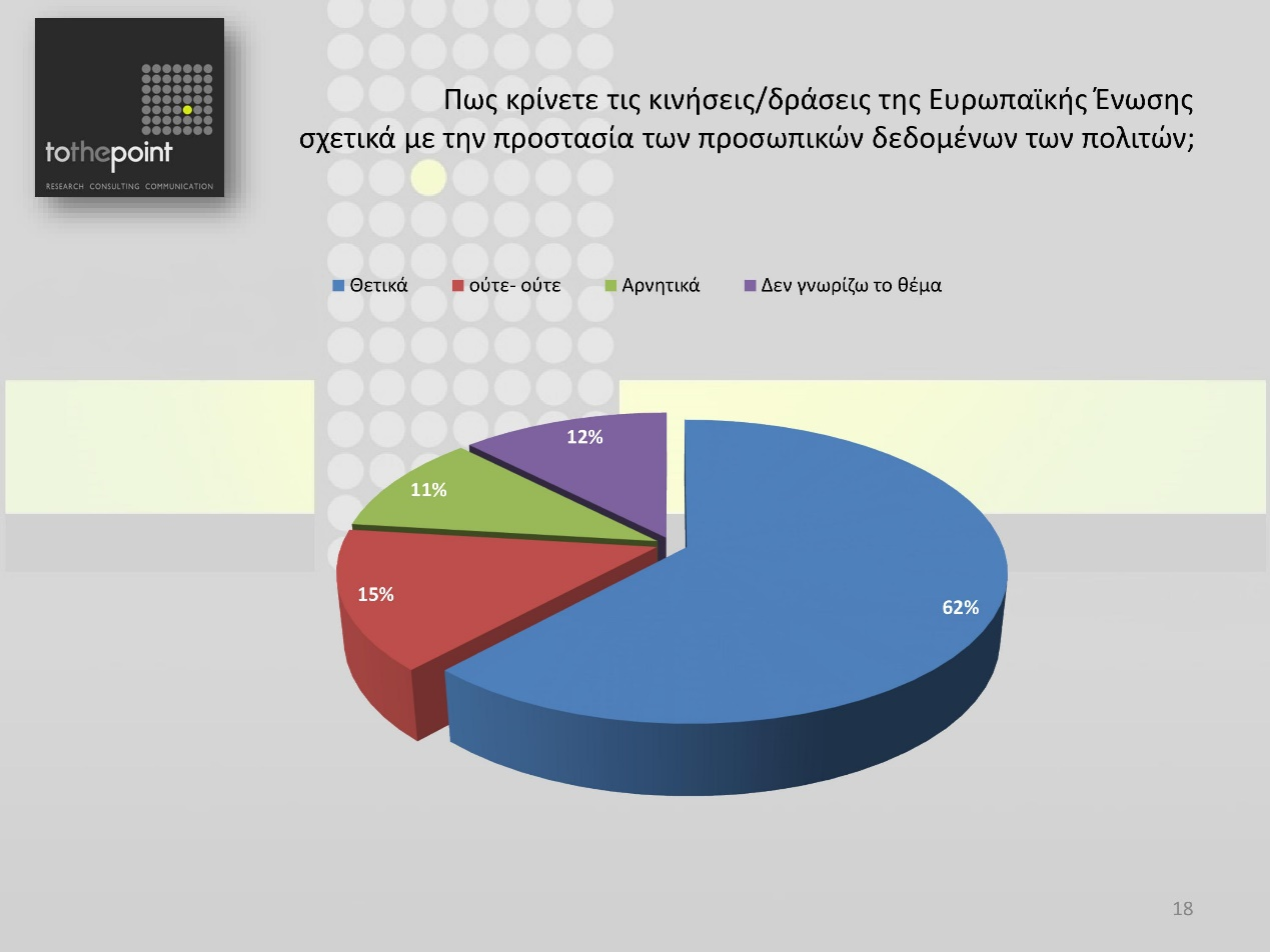 Ολοκληρώνοντας για την έρευνα, ένα πραγματικά ευχάριστο μήνυμα - ιδιαίτερα για εμάς που εργαζόμαστε από τις Βρυξέλλες και το Στρασβούργο με στόχο να βελτιώνουμε συνεχώς την καθημερινότητα των πολιτών - είναι το 62% των ερωτηθέντων που δηλώνουν πως κρίνουν θετικά τις δράσεις της Ε.Ε. σχετικά με την προστασία των προσωπικών δεδομένων. Και η πραγματικότητα είναι πως η Ευρωπαϊκή Ένωση έχει κάνει πάρα πολύ δουλειά στον τομέα της προστασίας των προσωπικών δεδομένων και είμαστε leader, δείχνει τον δρόμο σε παγκόσμιο επίπεδο.