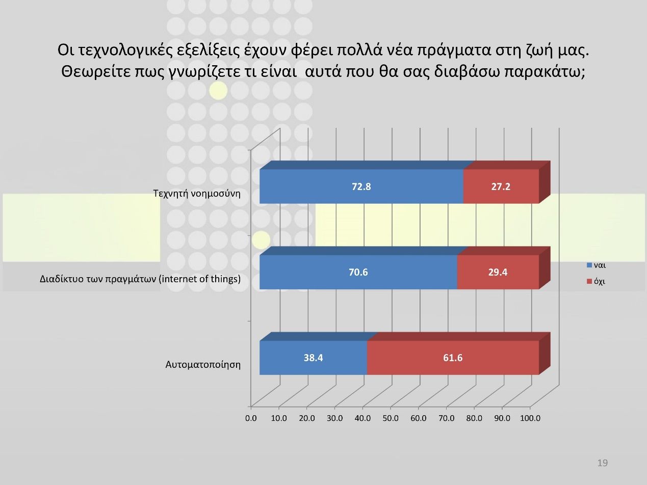 Τέλος, ας σημειωθεί πως  το 72% θεωρεί ότι γνωρίζει τι είναι η Τεχνητή Νοημοσύνη και το 70,6% το Διαδίκτυο των Πραγμάτων ενώ η τάση αντιστρέφεται σχετικά με την έννοια της αυτοματοποίησης (61,6% δε θεωρεί ότι γνωρίζει κάτι ουσιαστικό).