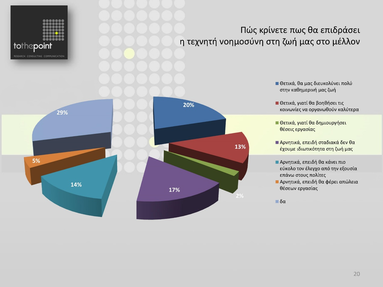 Όμως, η κοινή γνώμη της Θεσσαλονίκης στέκεται απολύτως αμφίθυμη έναντι της Τεχνητής Νοημοσύνης: το 35% συμφωνεί με διάφορες θετικές επιδράσεις της , στην καθημερινή ζωή, στην κοινωνία και στην εργασία ενώ το 36% πιστεύει πως θα έχει αρνητικές επιδράσεις (περισσότερο για την απώλεια της ιδιωτικότητας μας και πολύ λιγότερο για την πιθανή απώλεια θέσεων εργασίας).